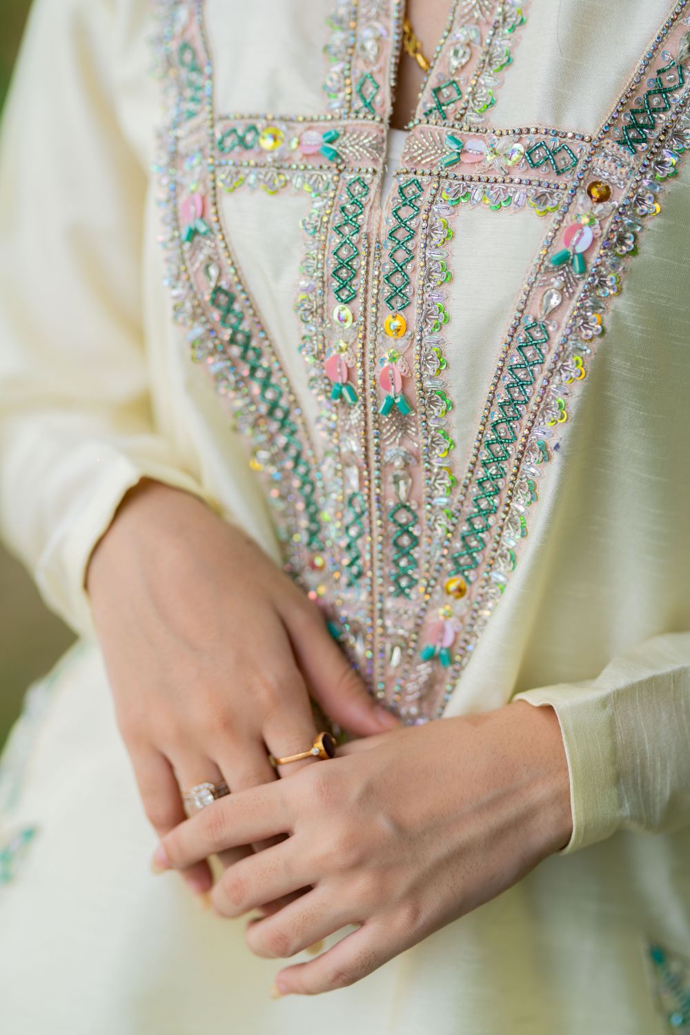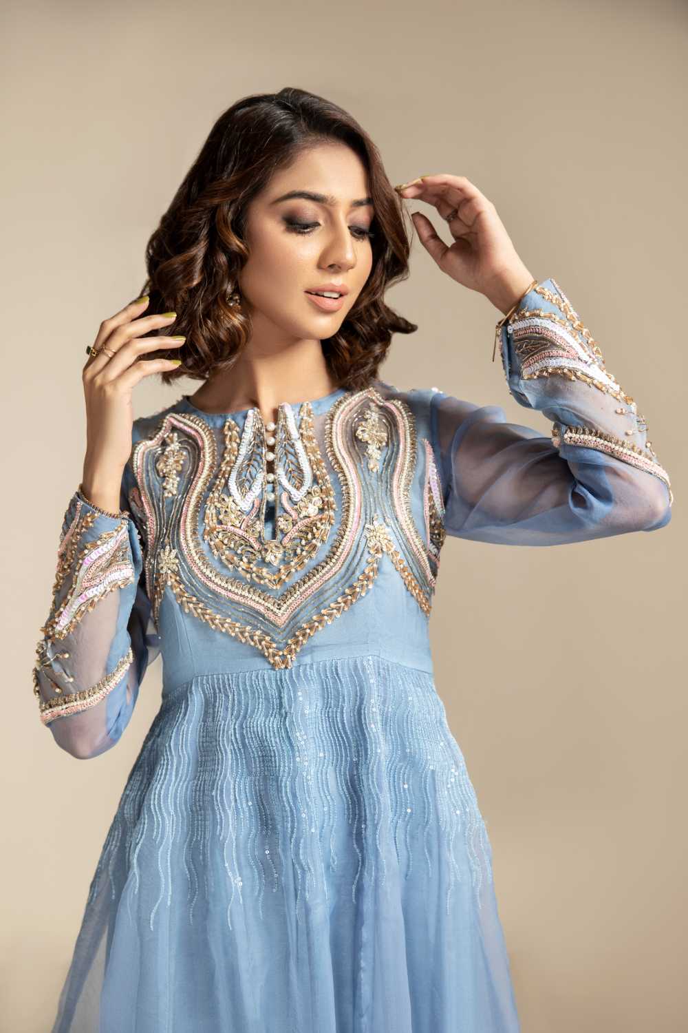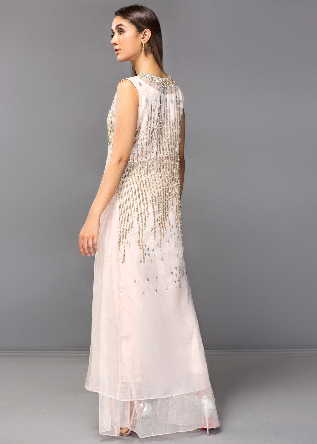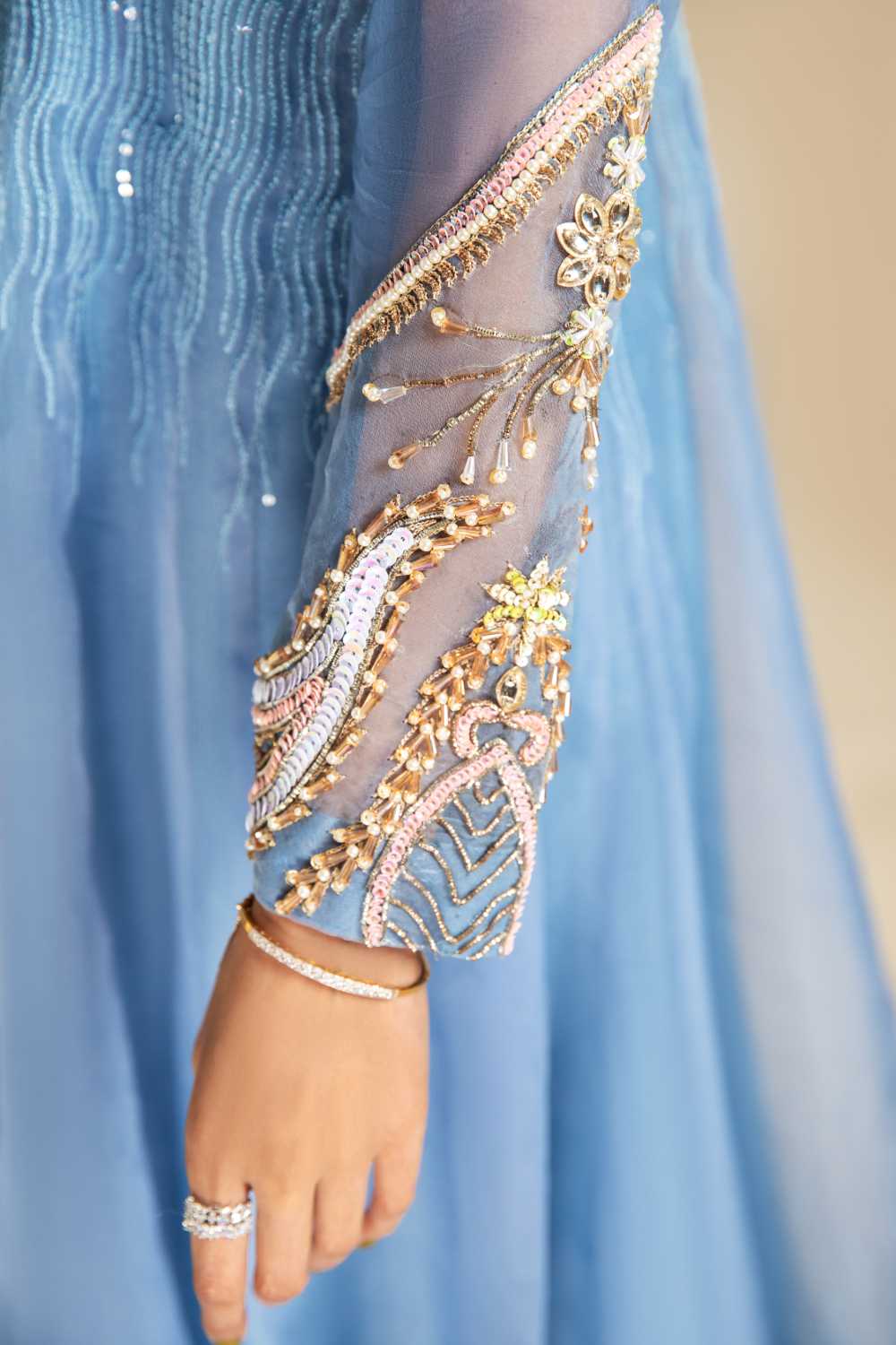 Step into elegance with our Rosé Garden Formal Ensemble, a timeless blend of pastel grace and exquisite embellishment adorned with hand-embellished floral motifs, zari work, and delicate sequin detailing.