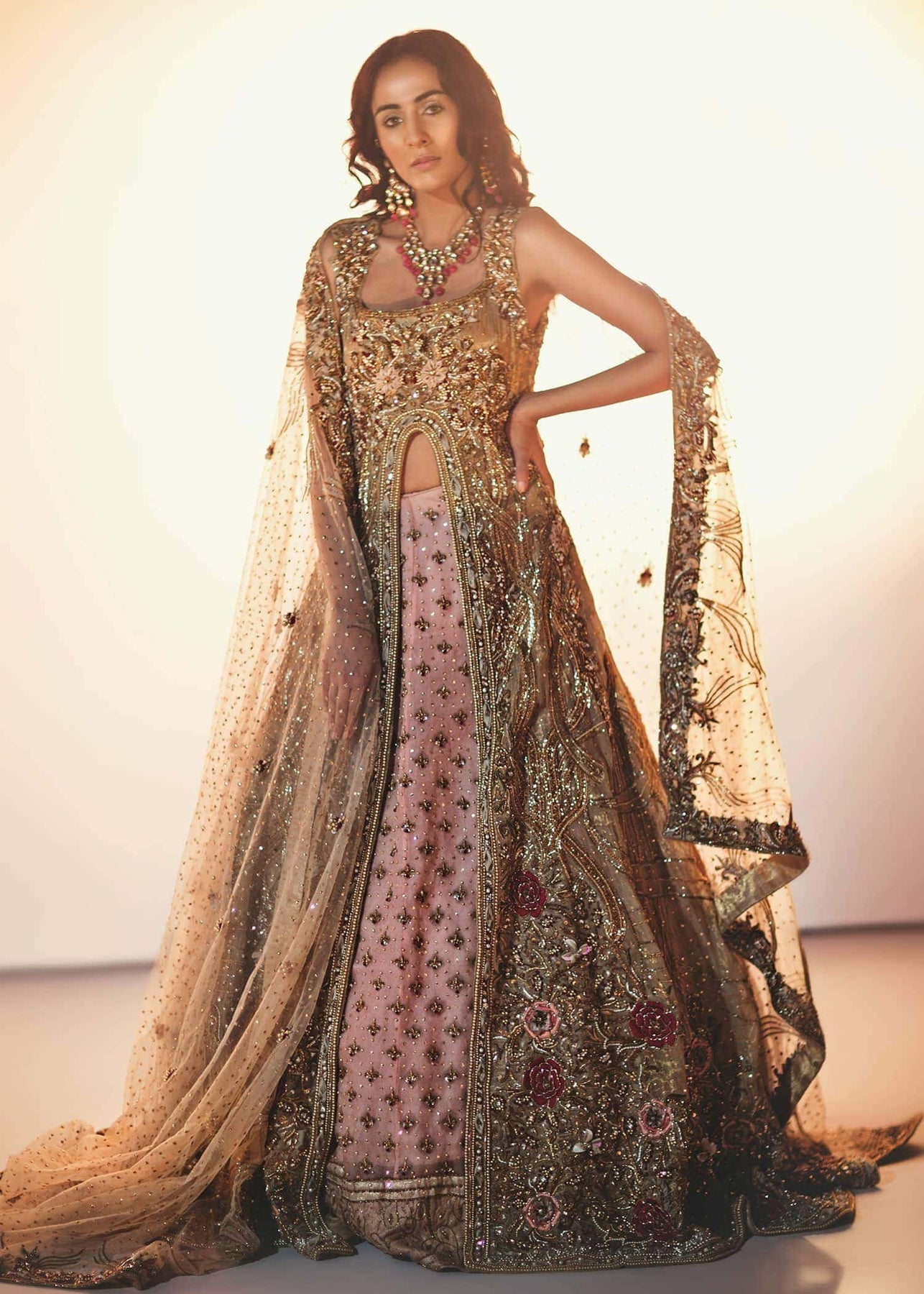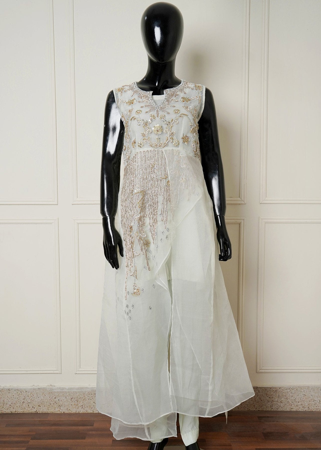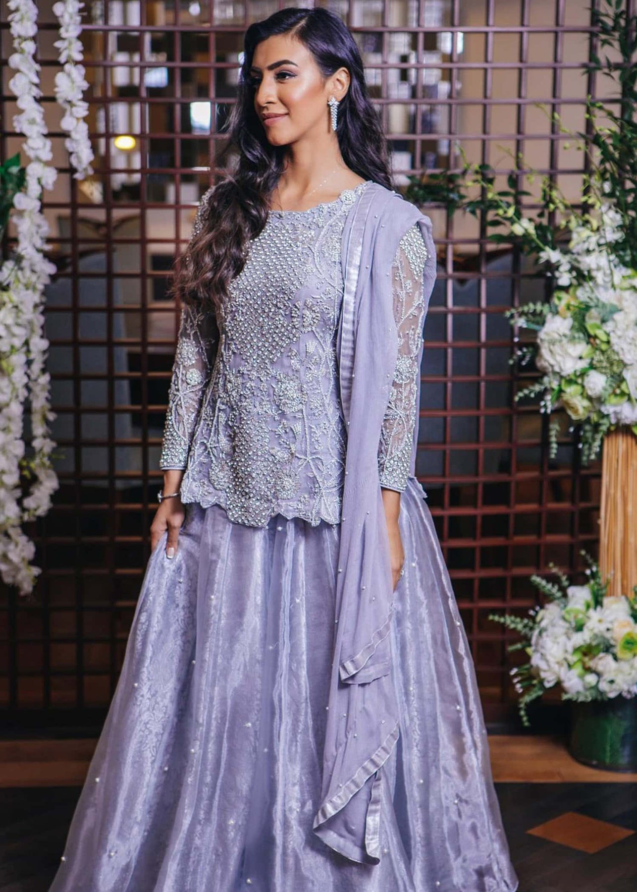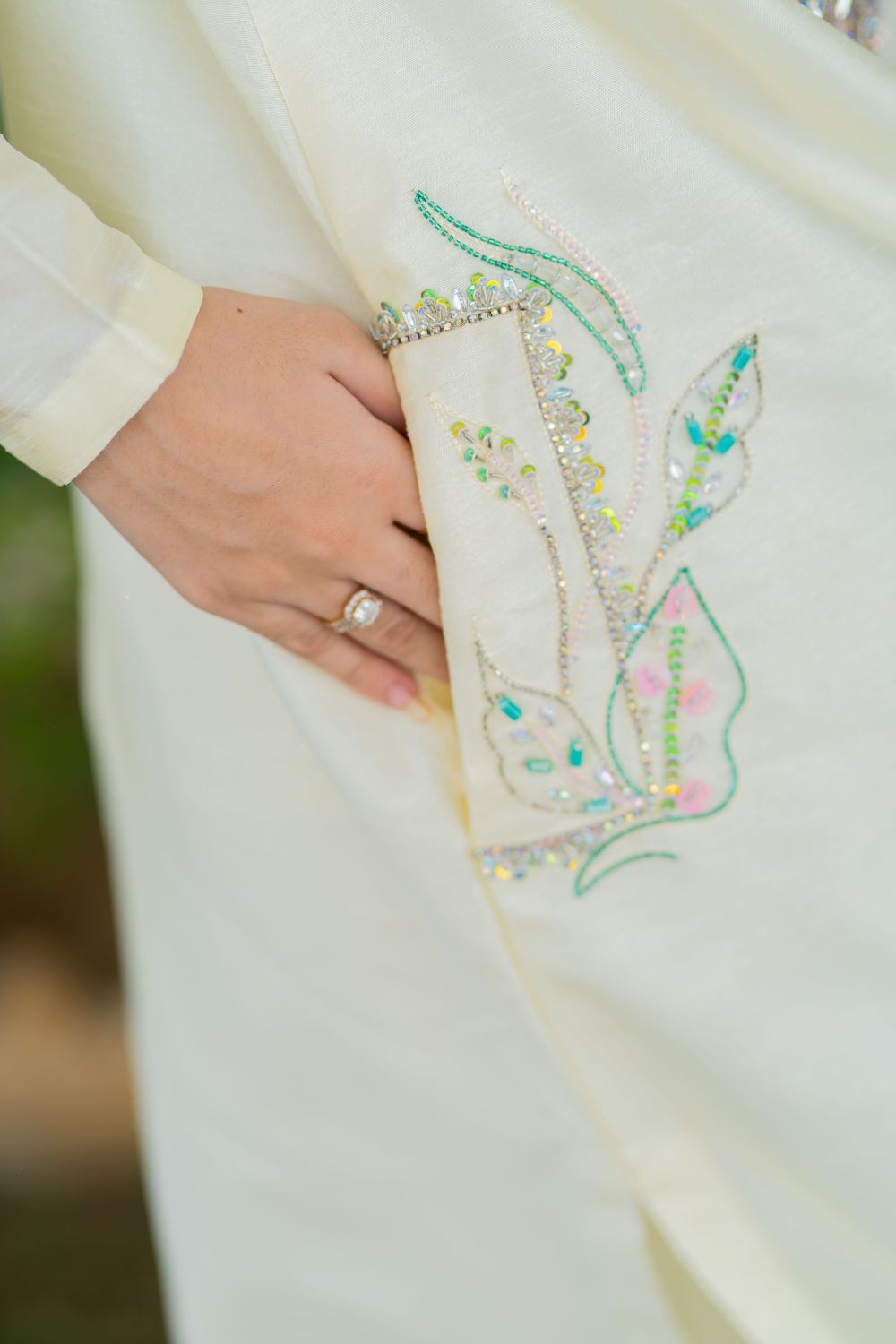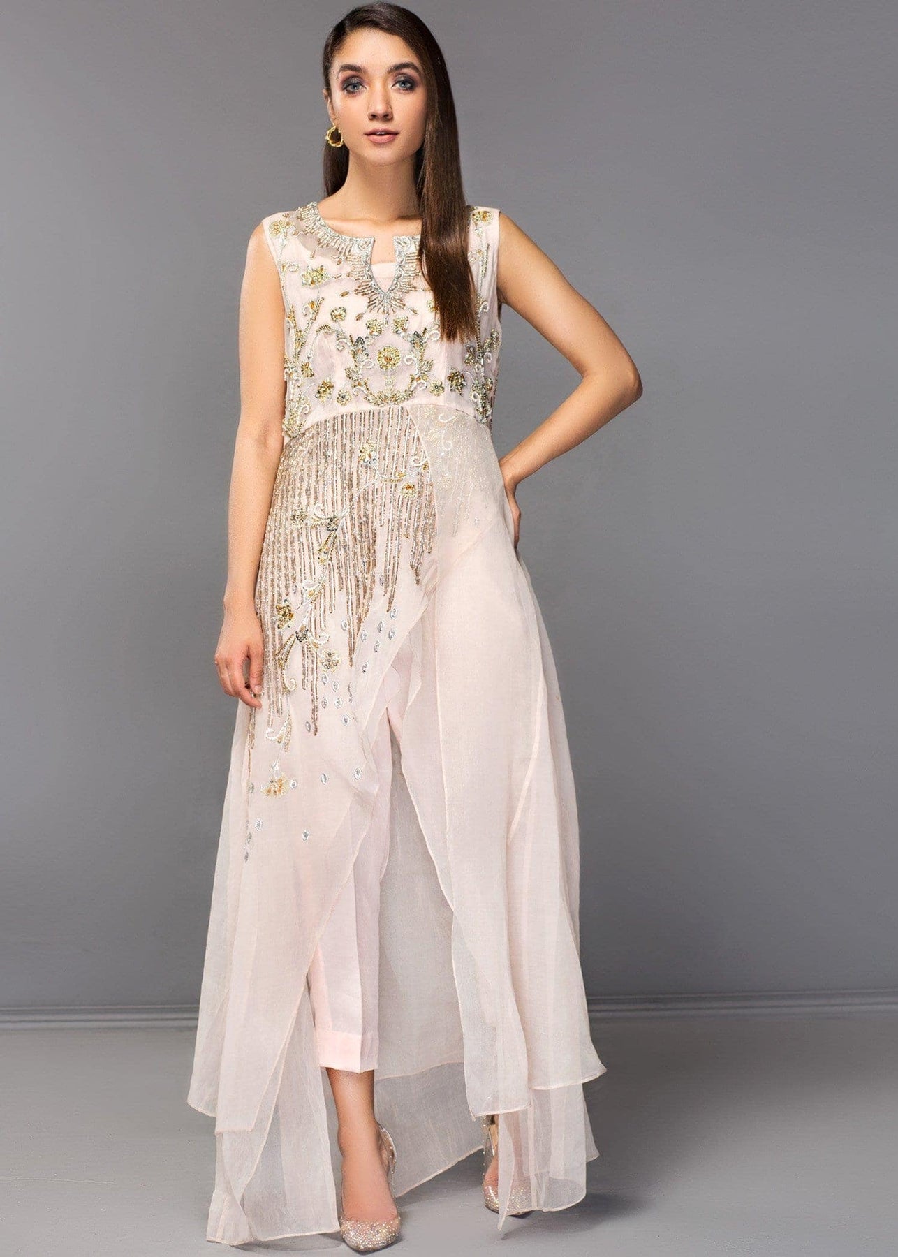 Step into elegance with our Rosé Garden Formal Ensemble, a timeless blend of pastel grace and exquisite embellishment adorned with hand-embellished floral motifs, zari work, and delicate sequin detailing.