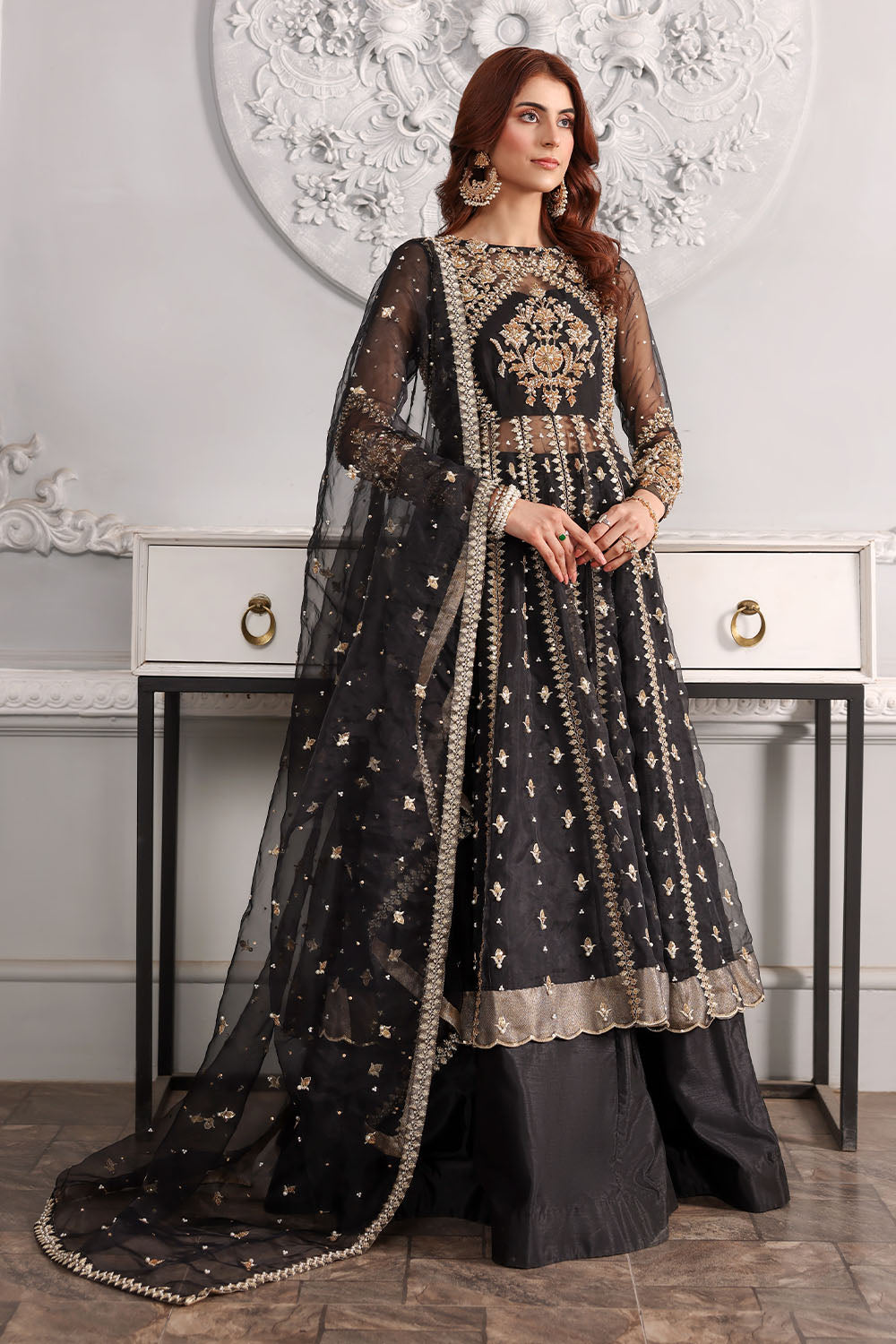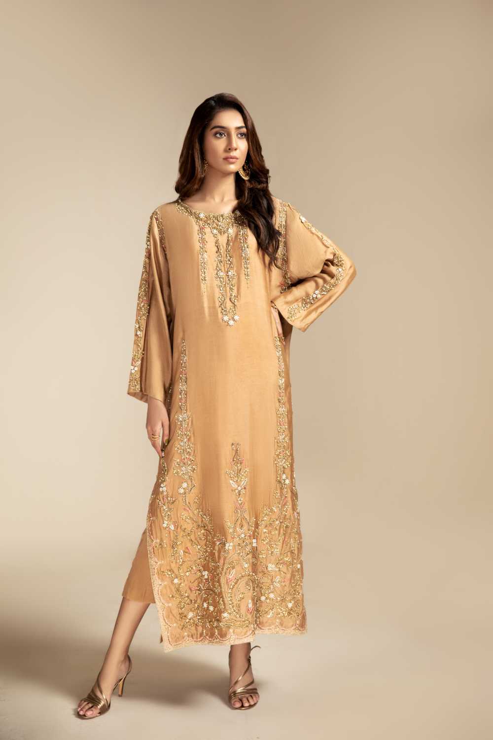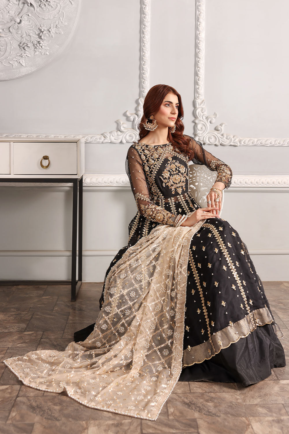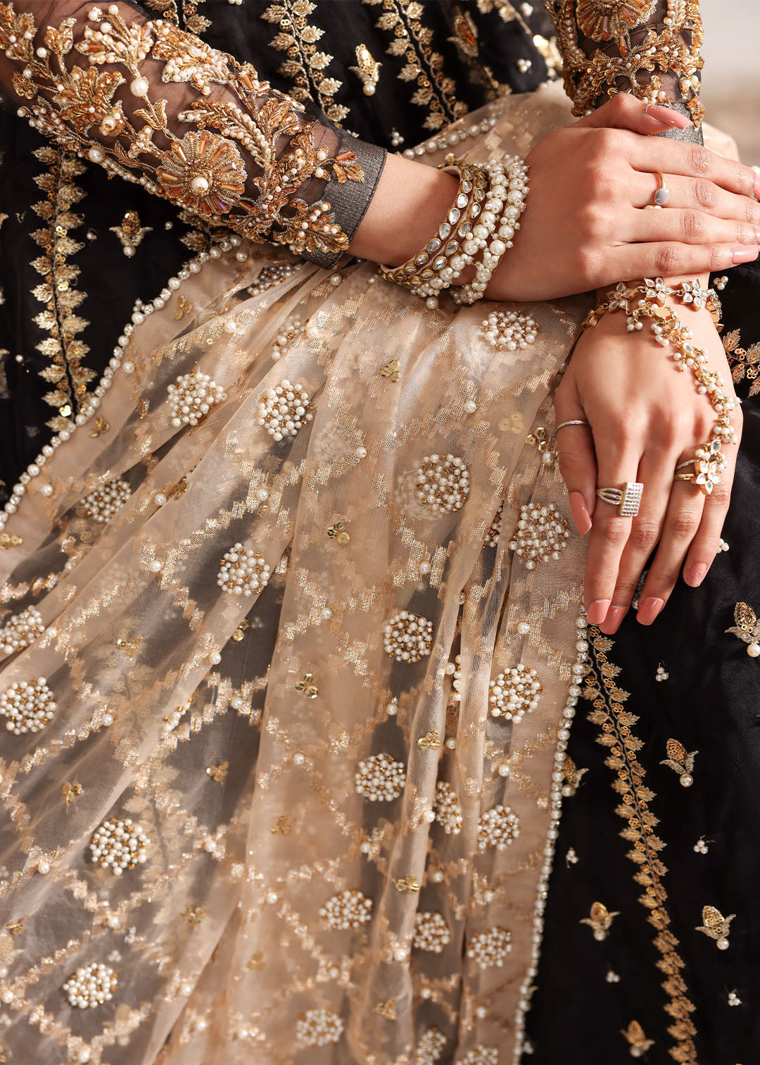 the top is a long, heavily adorned kameez with gold threadwork, paired with a matching printed farshi shalwar.
