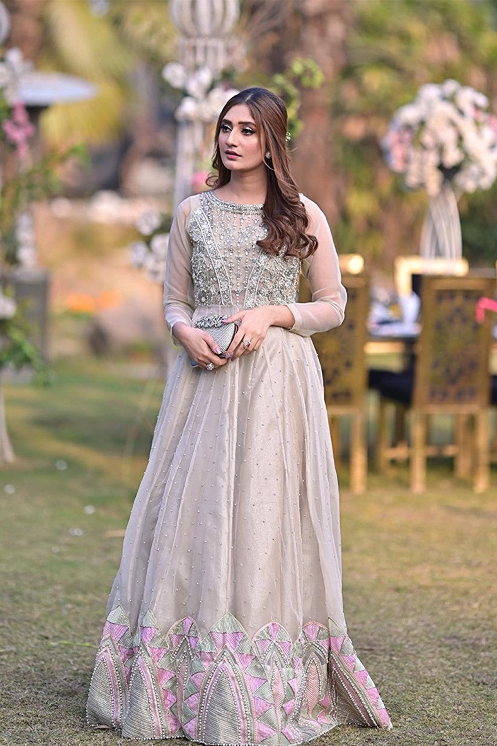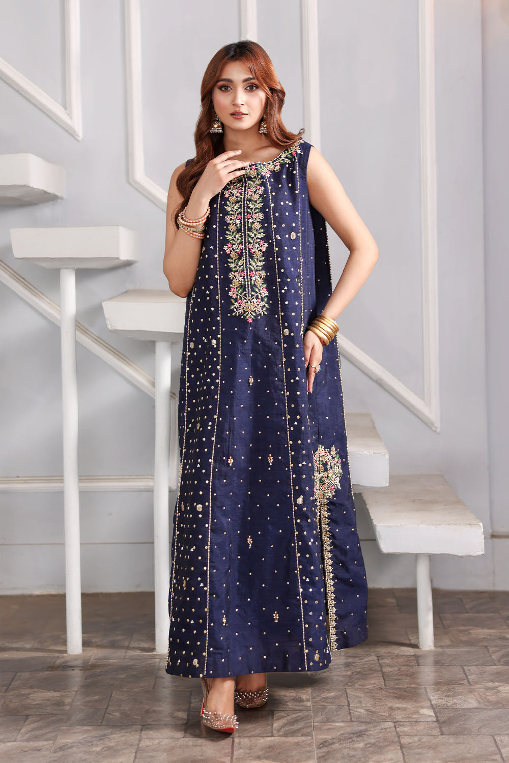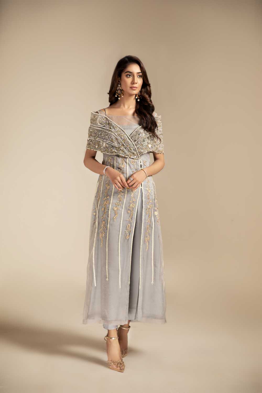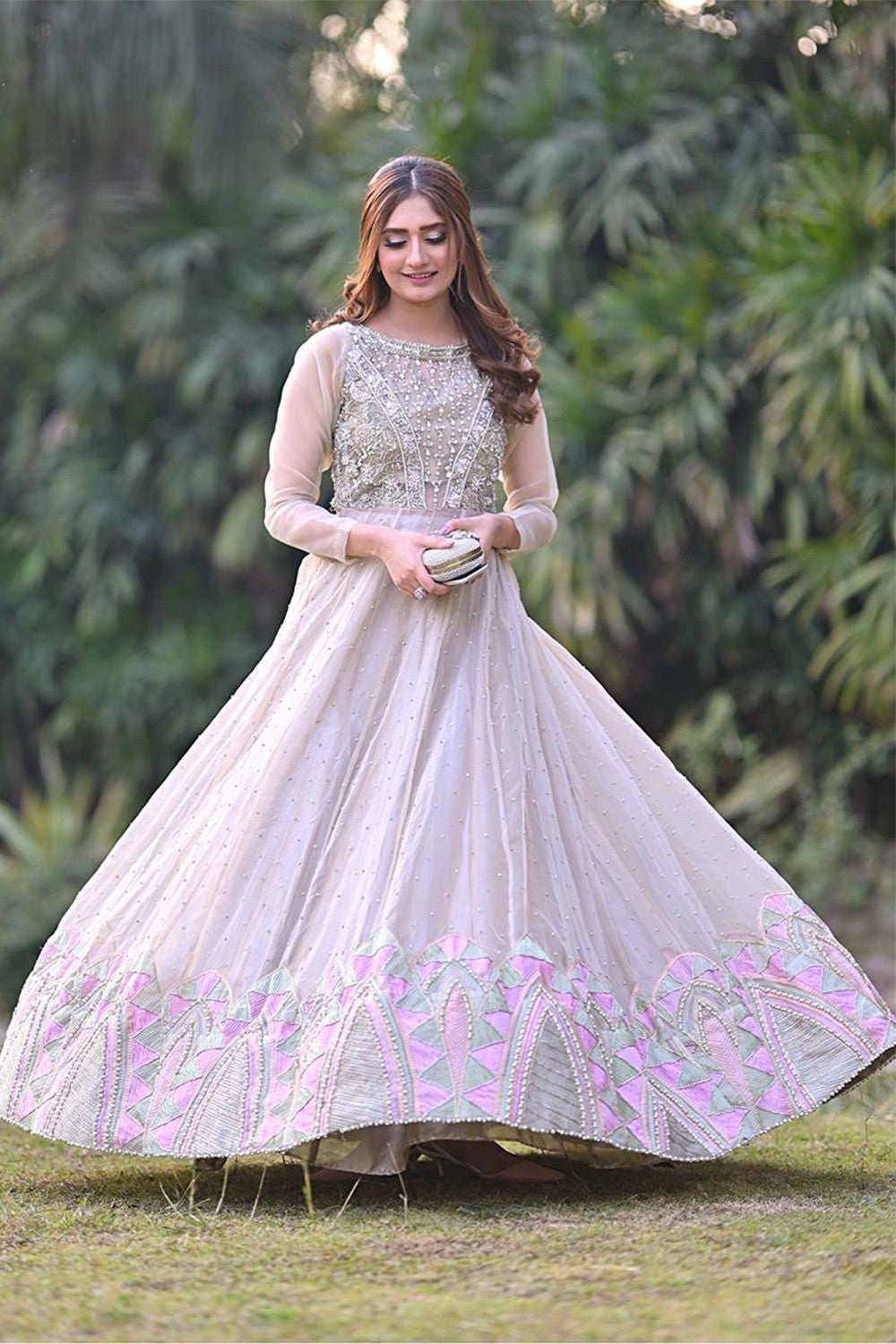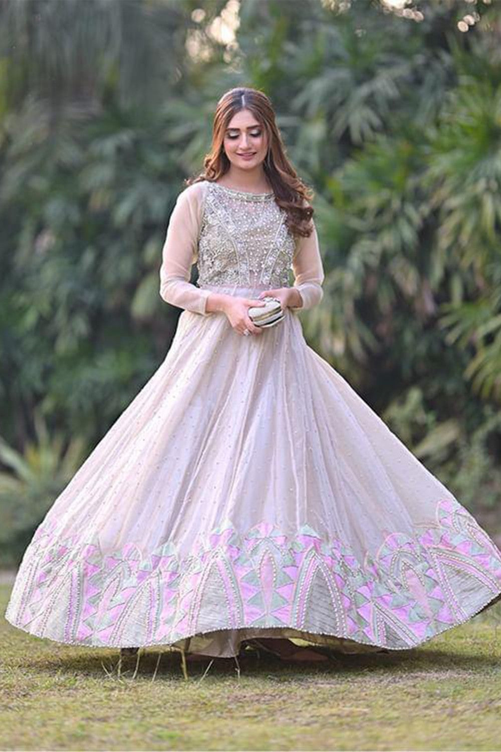 the top is a long, heavily adorned kameez with gold threadwork, paired with a matching printed farshi shalwar.
