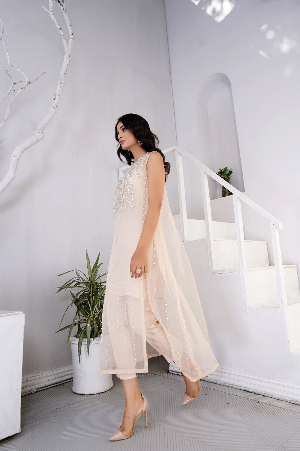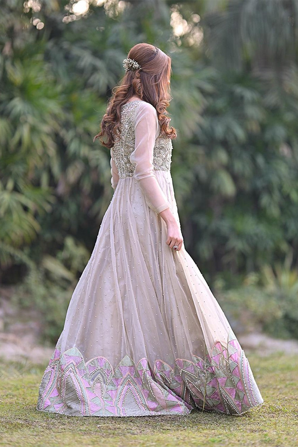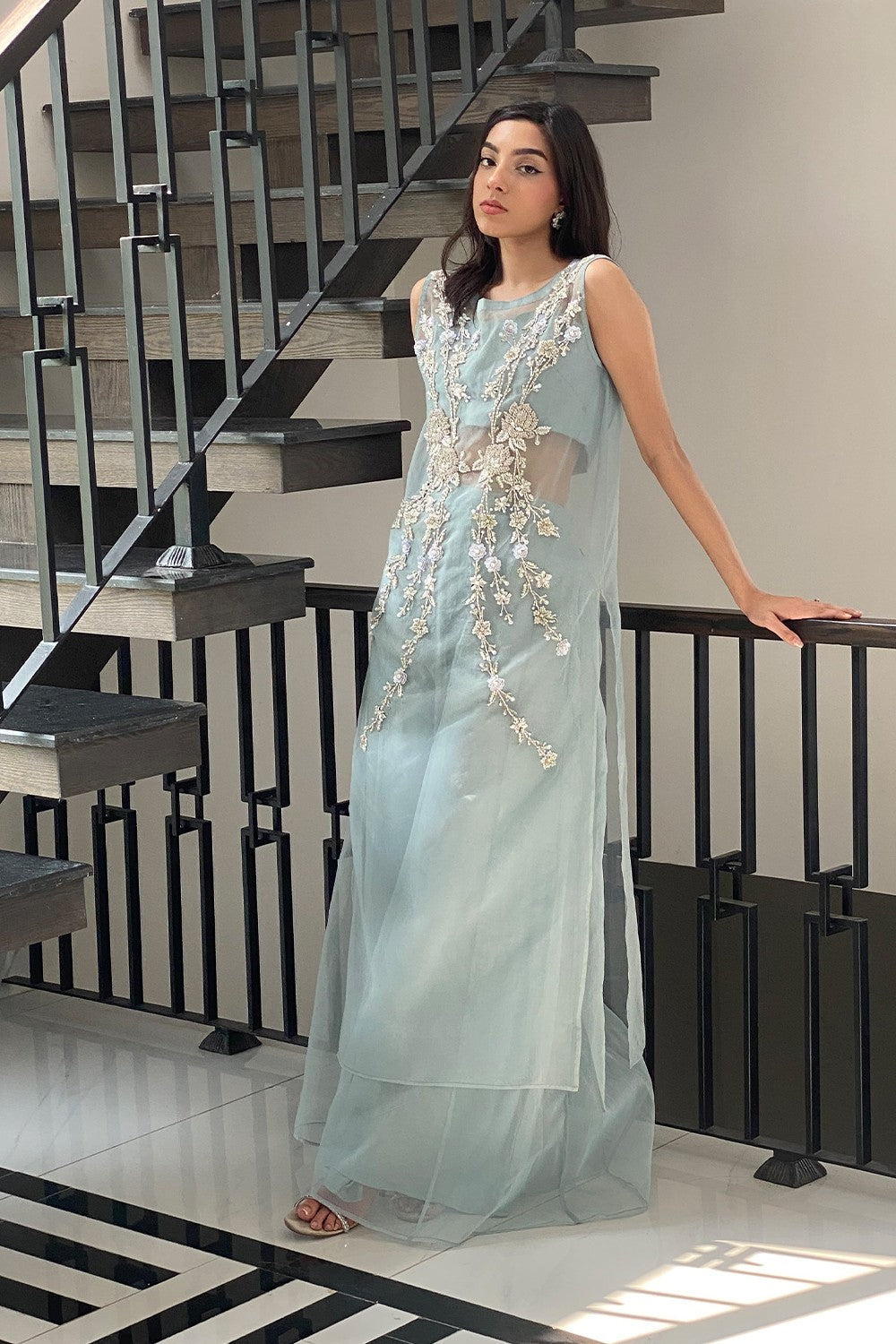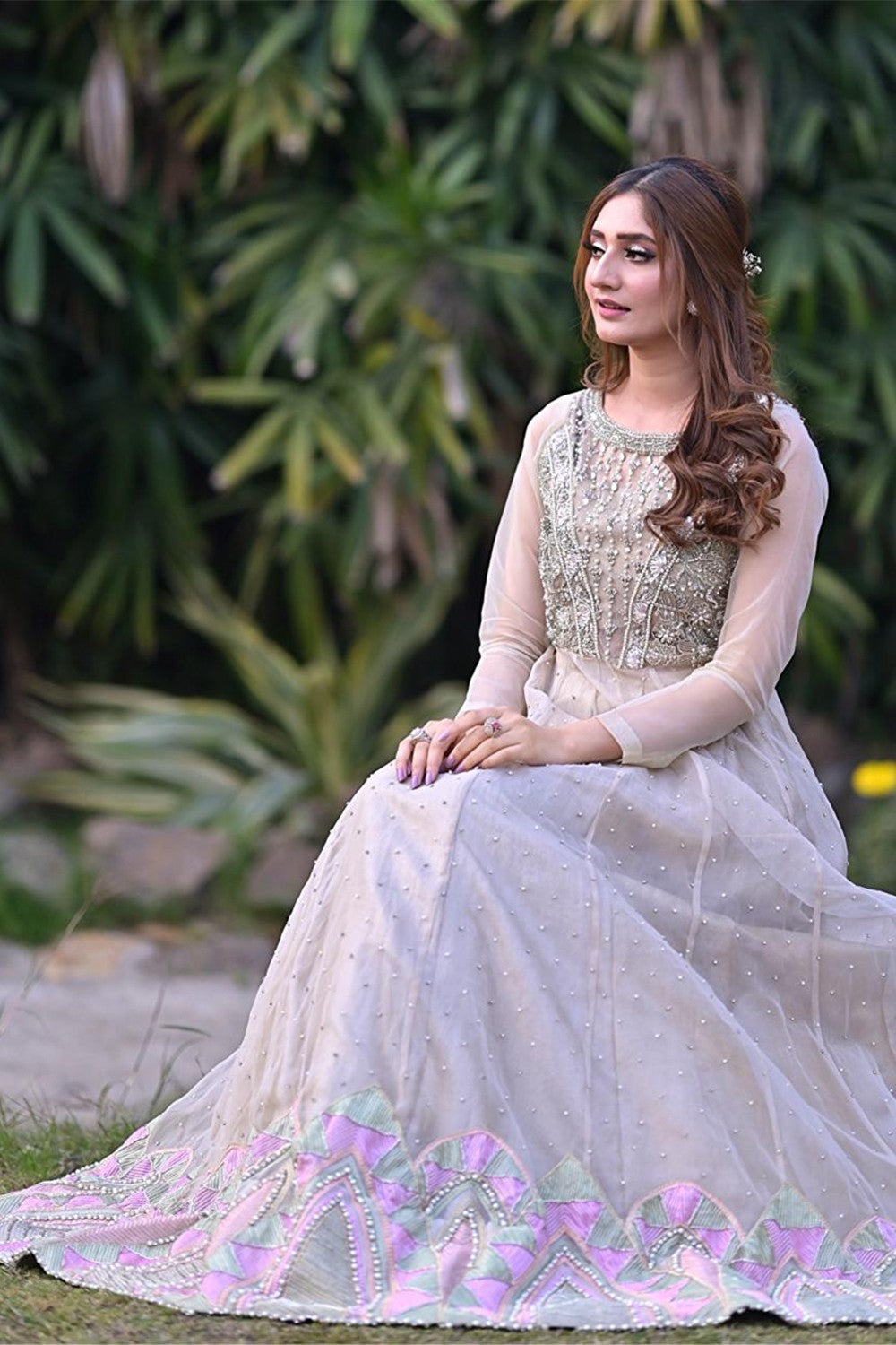 the top is a long, heavily adorned kameez with gold threadwork, paired with a matching printed farshi shalwar.