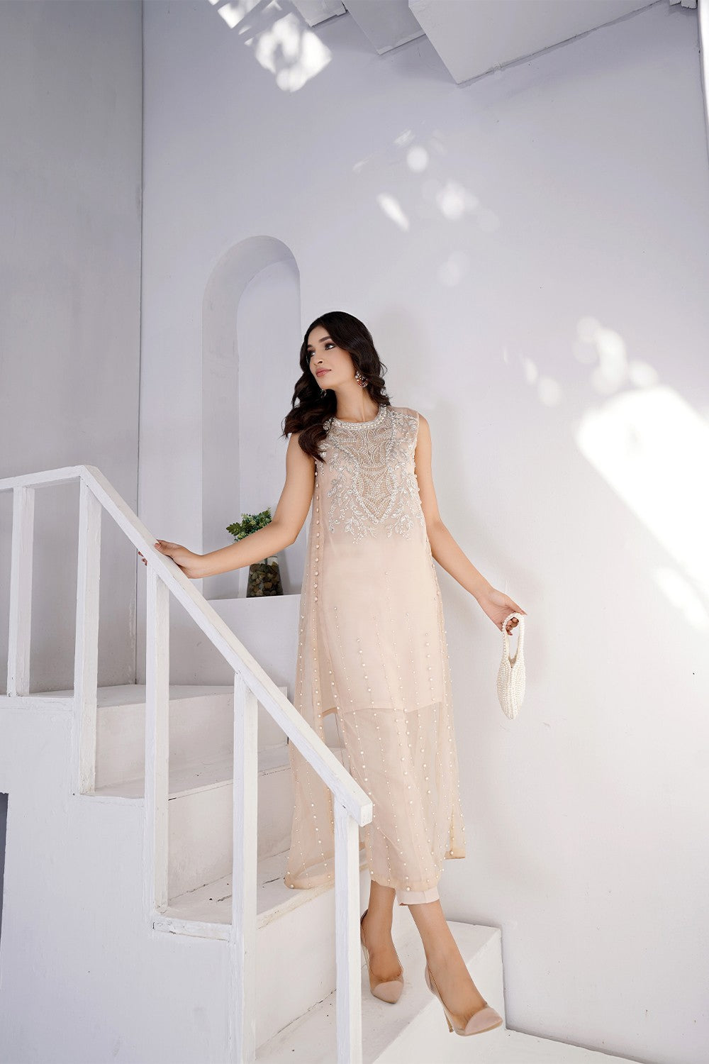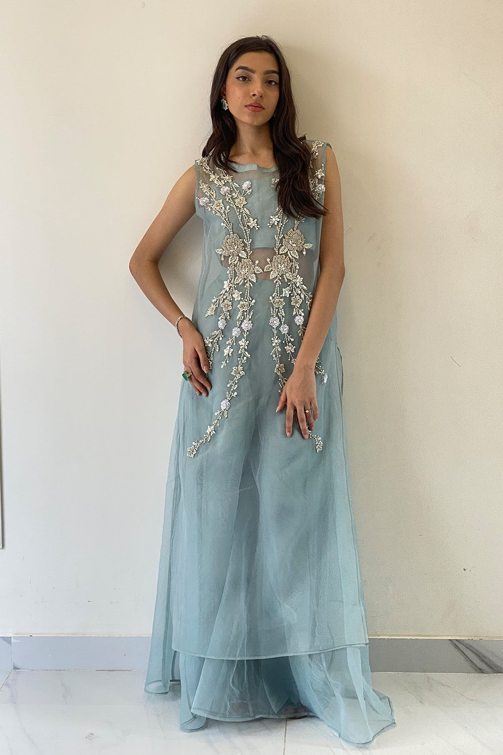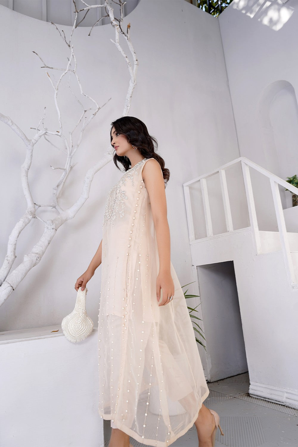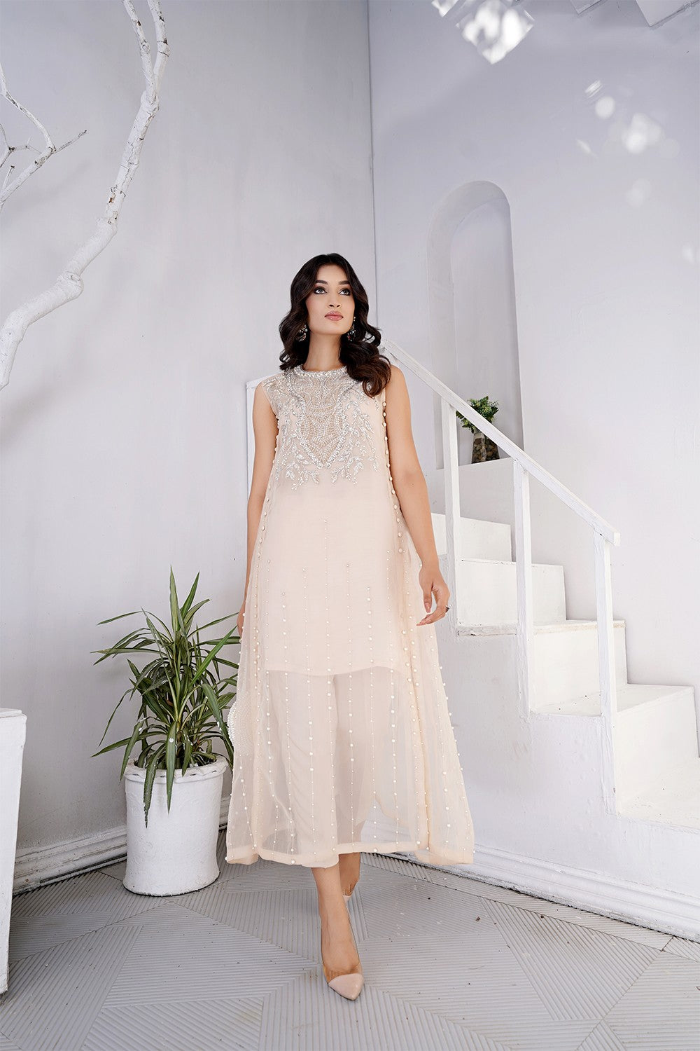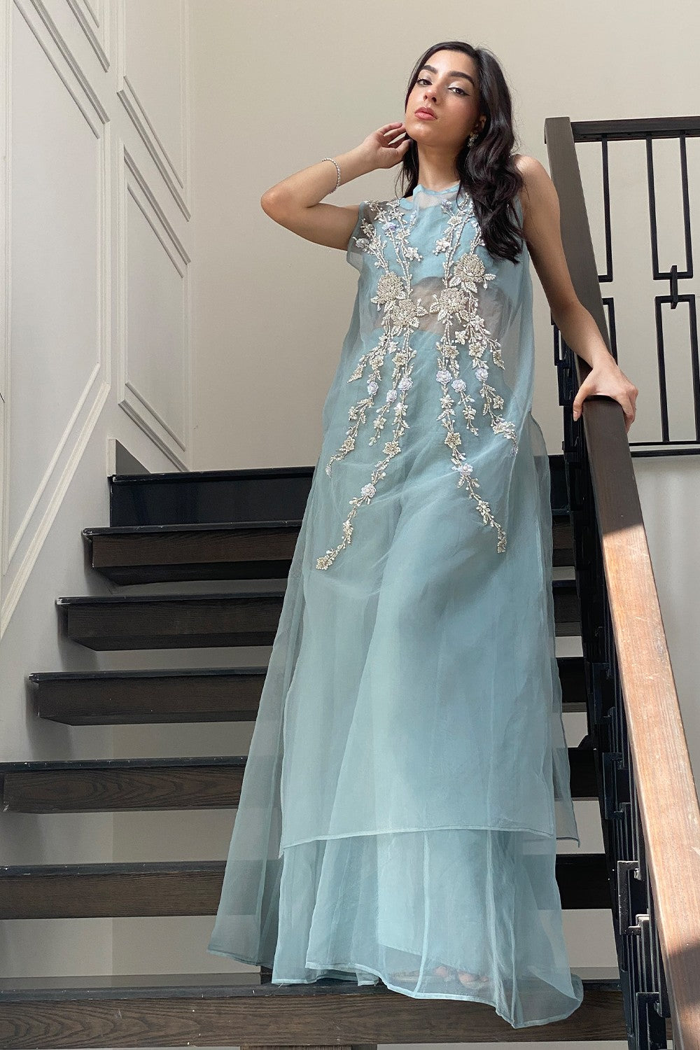 the top is a long, heavily adorned kameez with gold threadwork, paired with a matching printed farshi shalwar.