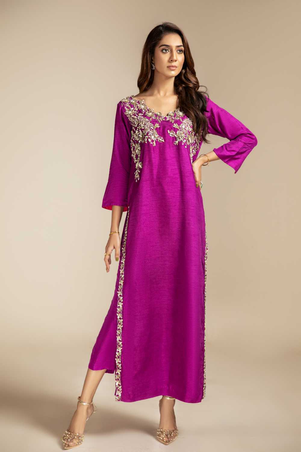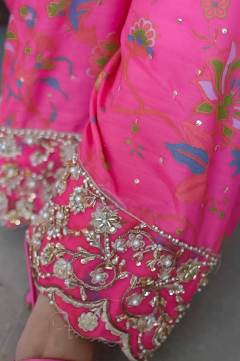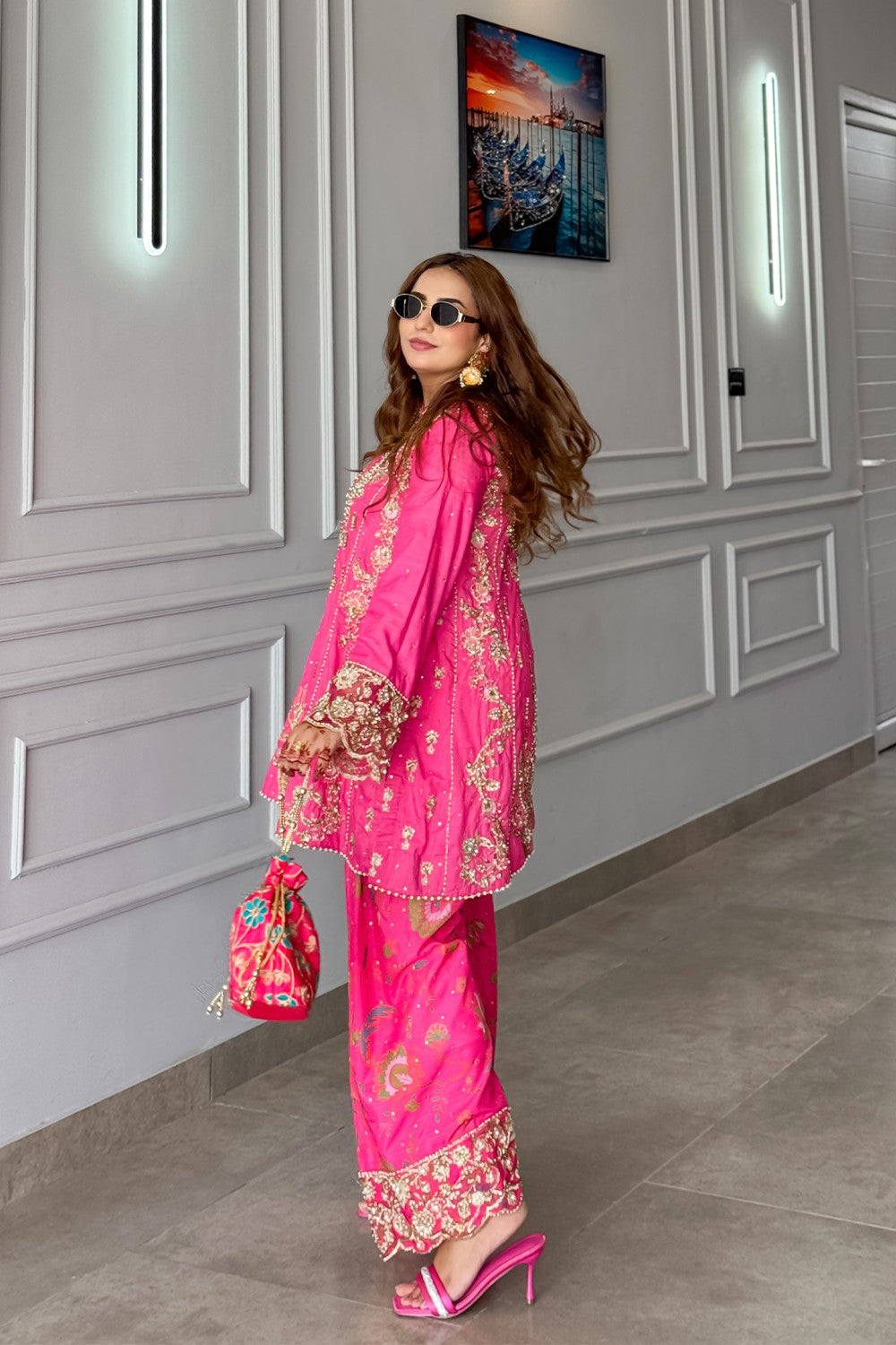 This outfit features a vibrant pink traditional ensemble with intricate embroidery and embellishments.
